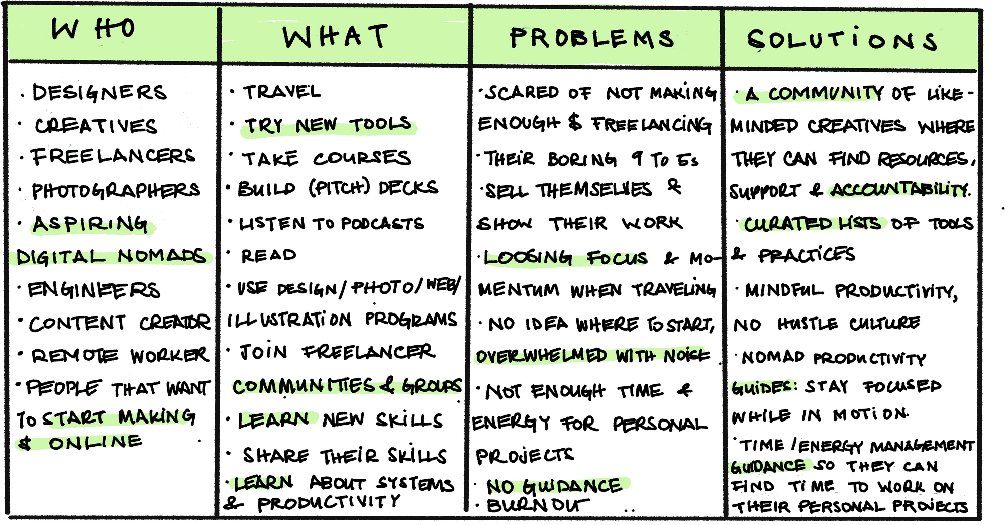 - Ask yourself when you start to work on a new project: is this solving a problem for a community? think about that community; what do they do, who are they, what are their pain points, how can you come in and make their lives easier?