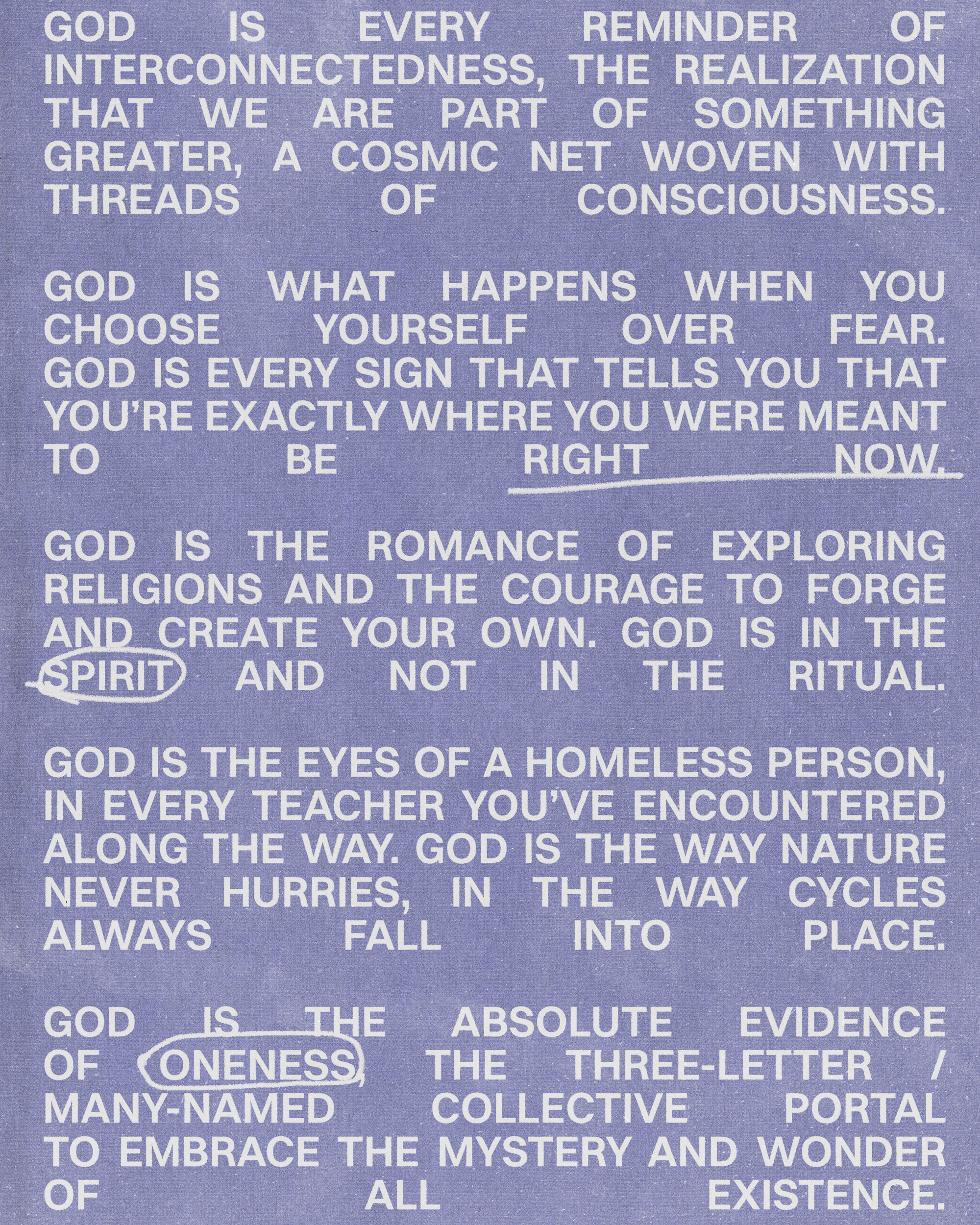 (God, Allah, the universe, your higher self, intuition. Pick your medium, but don’t let your connection with the divine turn into ritual.)