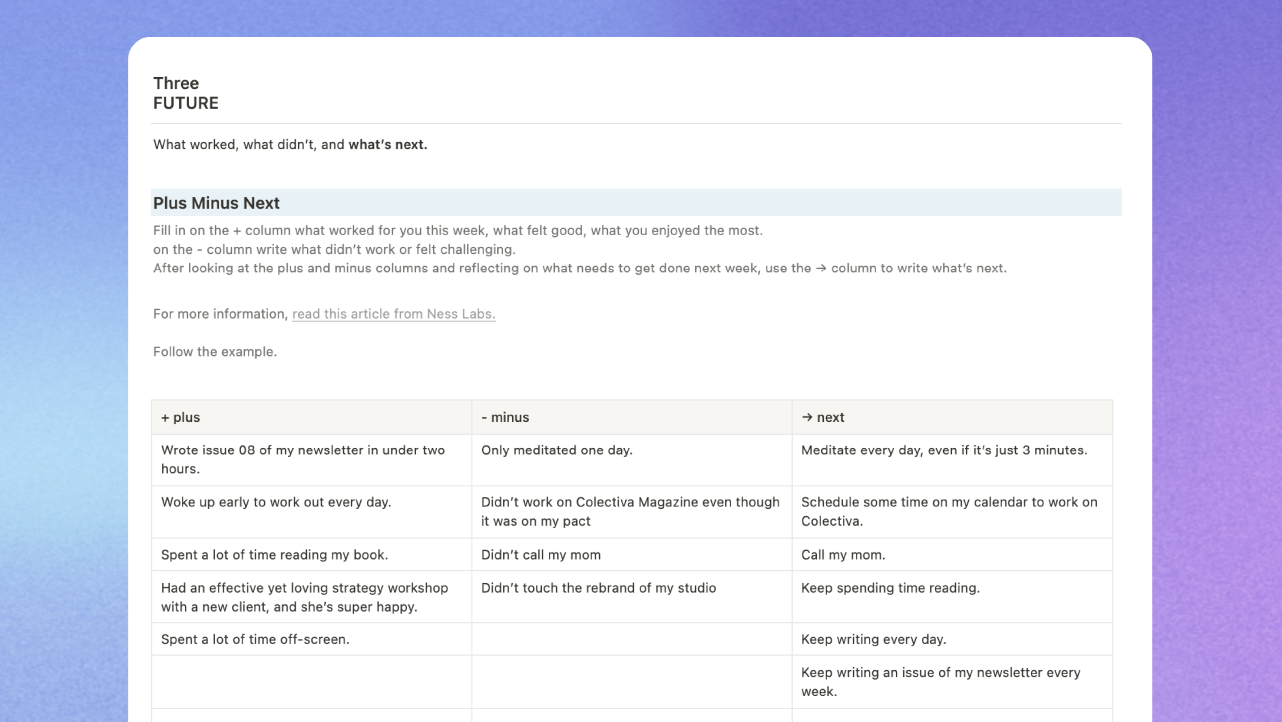 Finally, I move into the future section where I transform these insights into action. I use a simple Plus Minus Next chart and quickly jot down my highs (plus), my lows (minus), and the next steps for the upcoming week (next).