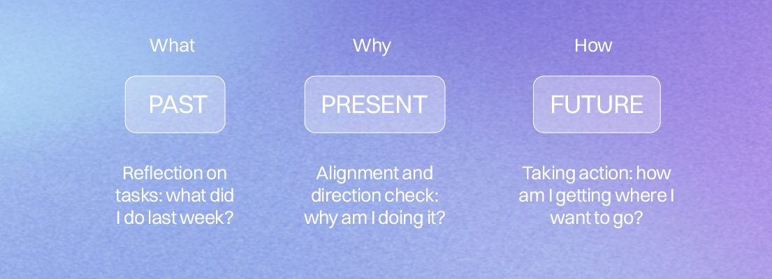 The past section works with the what: what did I do? The present inspects the why: why am I doing it? and finally, the future puts it all together into action: the how. How am I getting there?